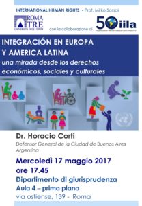 Il prossimo 17 maggio alle 17.45, presso il Dipartimento di giurisprudenza dell’Università Roma Tre, il Defensor General della Città di Buenos Aires, Dott. Horacio Corti, terrà il Seminario “Integracion en Europa y America Latina – una mirada desde los derechos economicos, sociales y culturales”.
